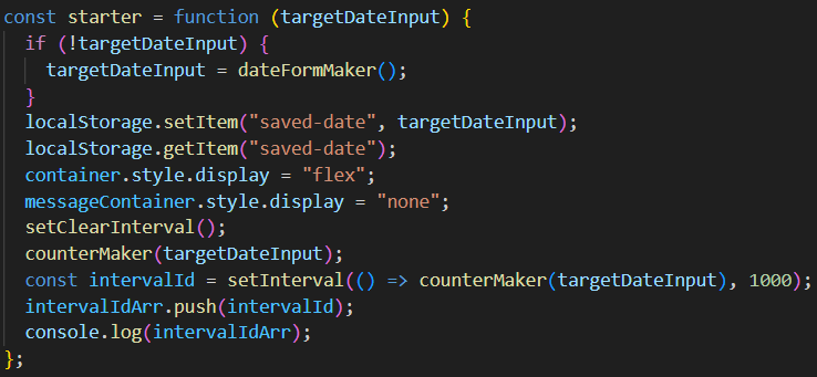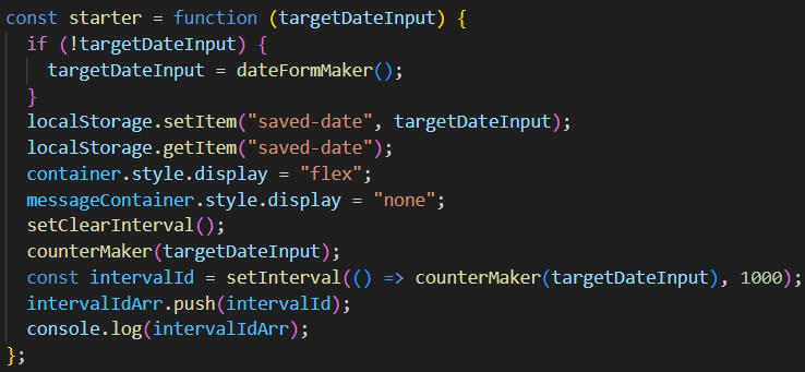그렇다면 starter()에서 localStorage에 날짜를 저장하지 않고 counterMaker()에서 날짜를 계산하기 전에 저장하면 된다.