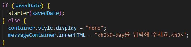 최초의 화면이 렌데링될 때, 최초의 자바스크립트가 해석될 때 이 savedDate라고 하는 변수에 저장된 값이 있는지 조건문을 통해 확인한다.
