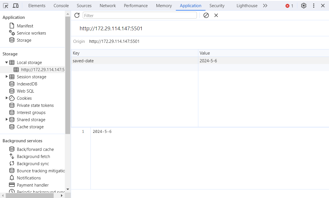 크롬에서 작동해보면 local Storage에 저장된 saved-date를 볼 수 있다.