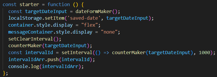 그렇다면 starter()에서 localStorage에 날짜를 저장하지 않고 counterMaker()에서 날짜를 계산하기 전에 저장하면 된다.