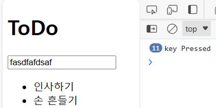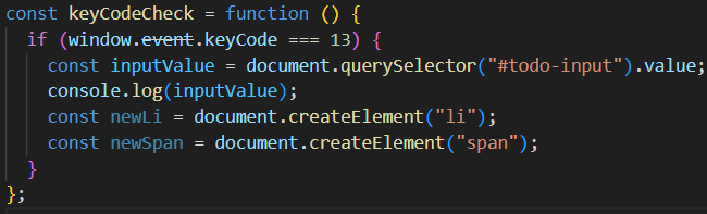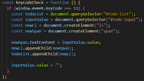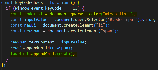 이를 통해 엔터키의 keyCode(13)가 나오는 경우 리스트에 추가되도록 하는 조건문을 걸면 된다.