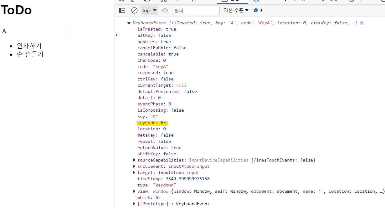 'A'의 아스키코드가 keyCode에 들어가는 것을 알 수 있다.