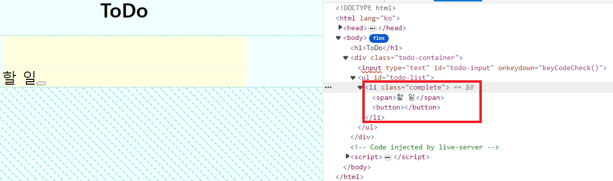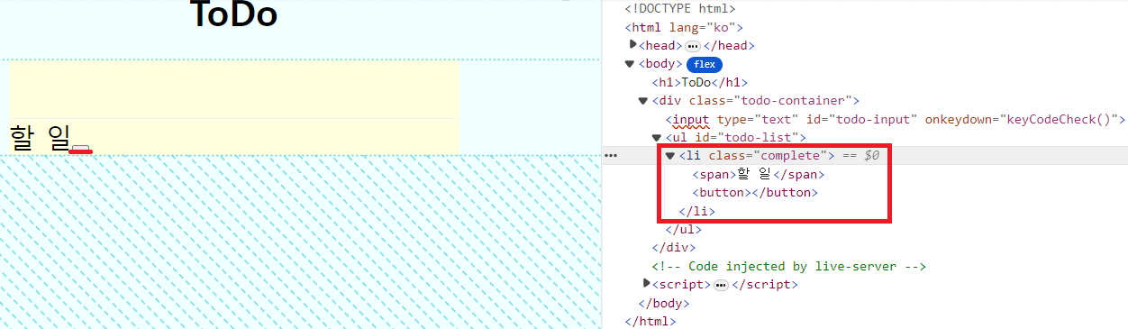 옆에 있는 버튼을 누르니까 <li>에 complete 클래스 속성이 생성됐다.