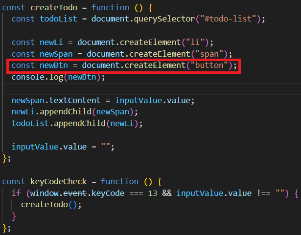 입력된 할 일에 버튼을 추가할 것이기 때문에 태그 생성 메소드 createElement를 사용했다.