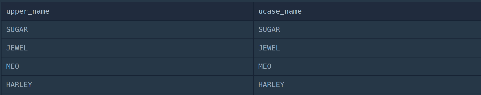 | 1 2 | SELECT name, upper(name) upper_name from animal_ins |