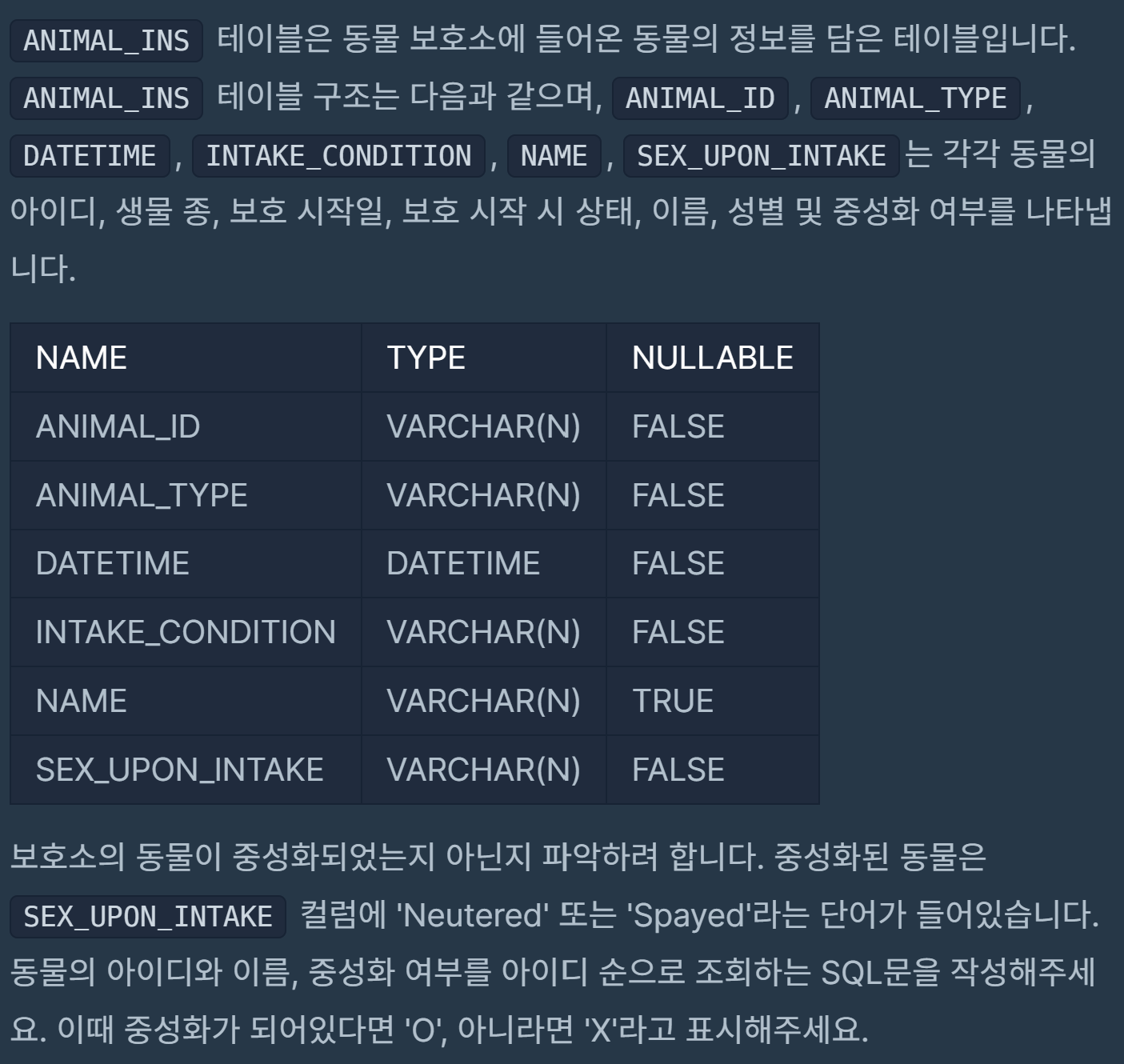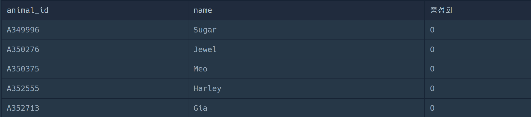 | [mysql/oracle] 이름에 el이 들어가는 동물 찾기 (0) | 2023.01.28 |