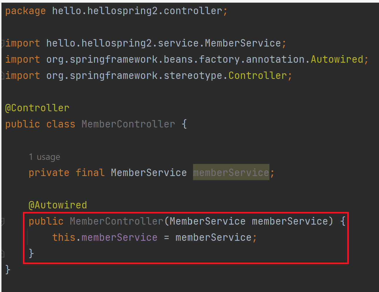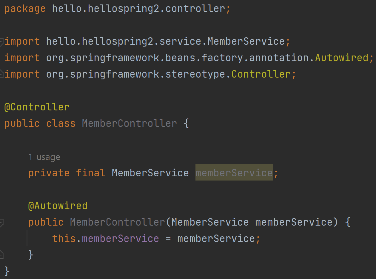 생성자를 통해 memberService가 MemberController에 주입된다.