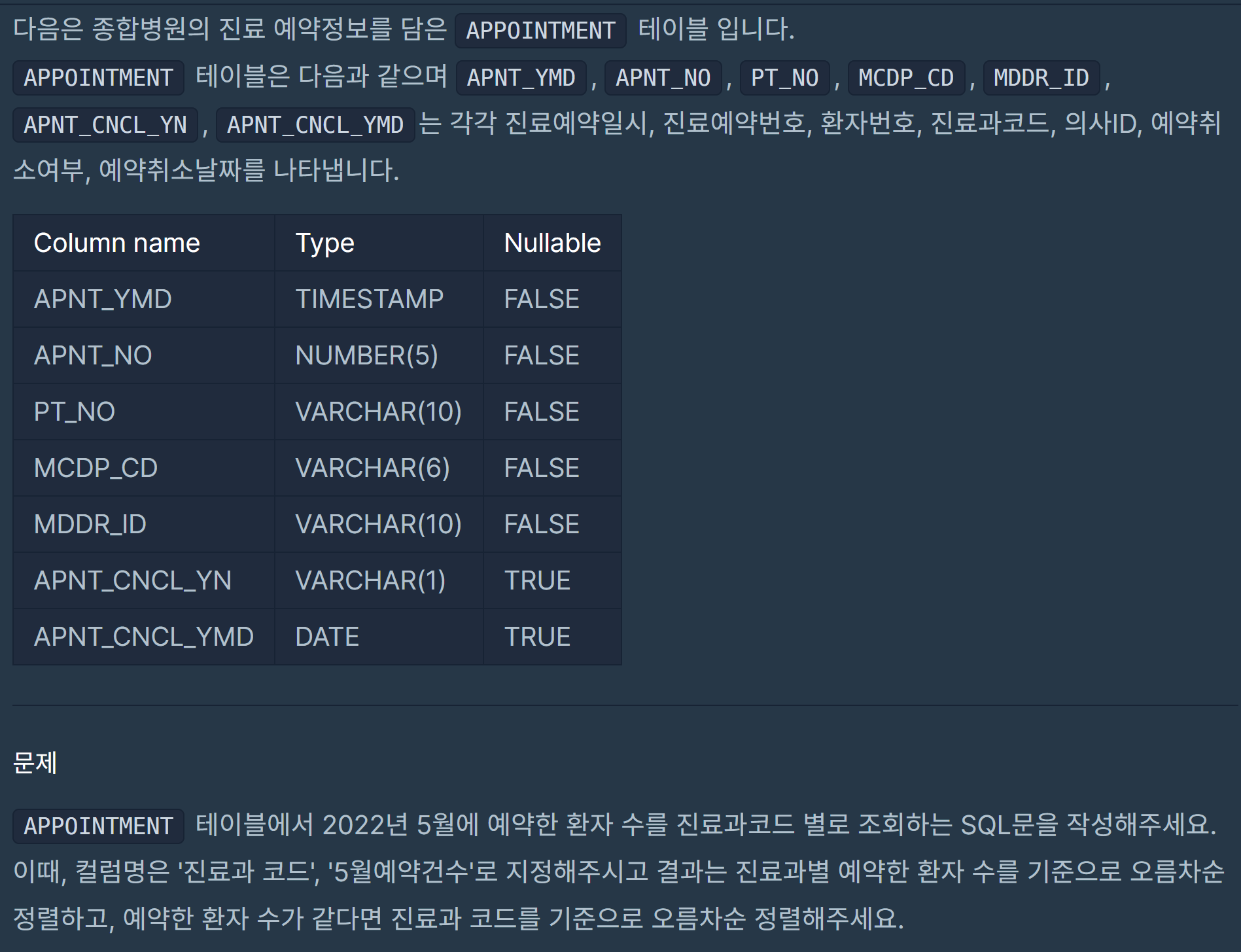 먼저 where절로 2022년 5월 자료만 뽑아내고 진료과코드별로 그룹을 묶어주면 된다.
