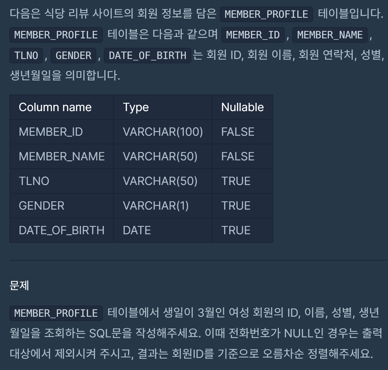 [mysql/oracle] 3월에 태어난 여성 회원 목록 출력하기