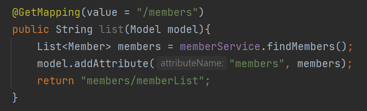 model.addAttribute("members", members) : view쪽에서 members라는 키를 가진 곳에 member 리스트를 담는다.