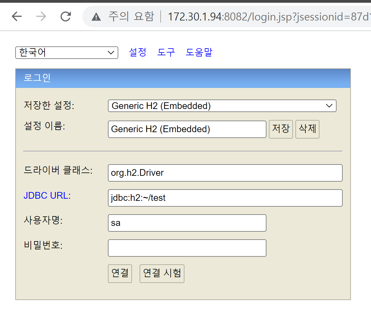 그럼 이제부터 JDBC URL에 jdbc:h2:tcp://localhost/~/test로 적어준다.