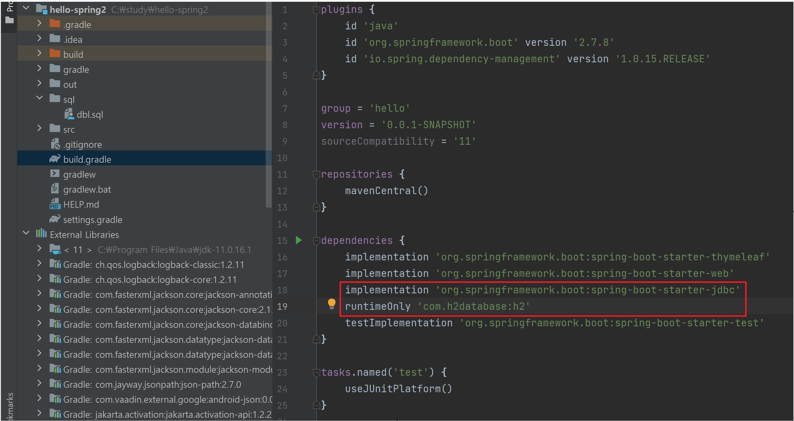 build.gradle에 jdbc, h2 데이터베이스 라이브러리를 추가한다.(옆에 코끼리 모양 뜬 거 눌러서 import 시켜줌)