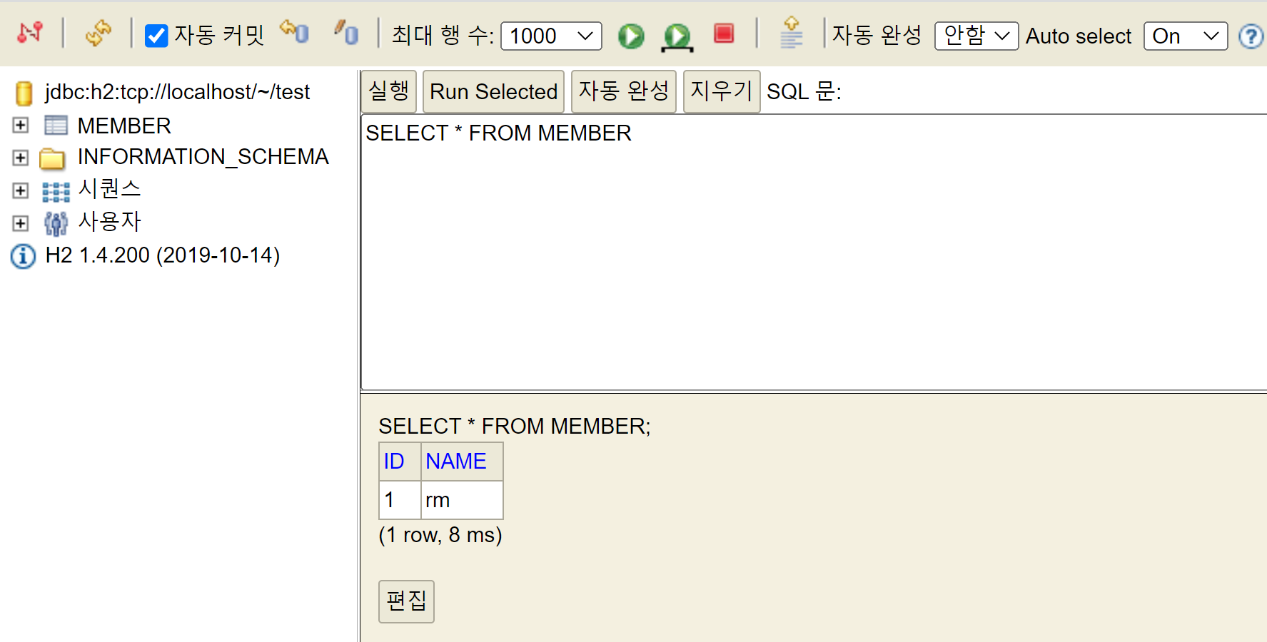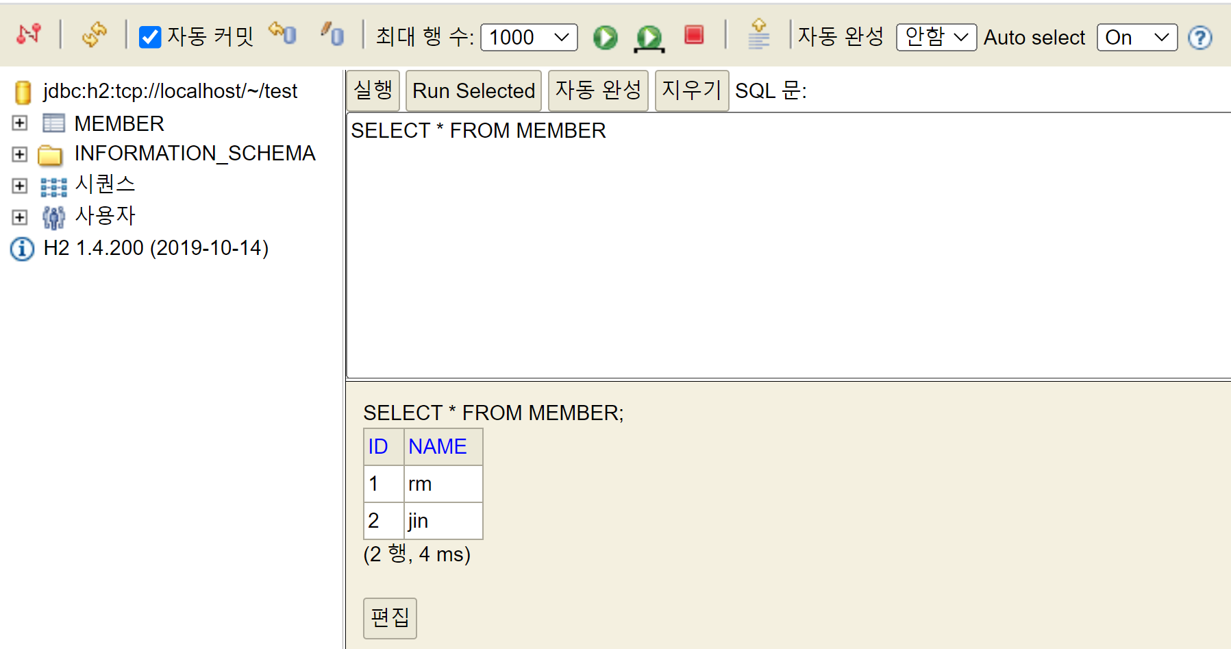 이 정보가 h2 데이터베이스에도 있으면 성공