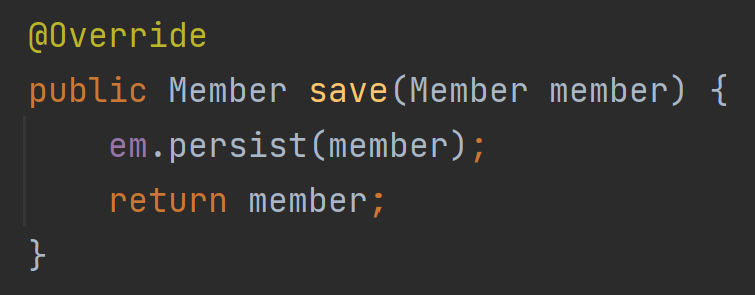 : member라는 객체를 db에 저장한다.(엄밀히 말하면 영속성 컨텍스트에 저장하는 것)