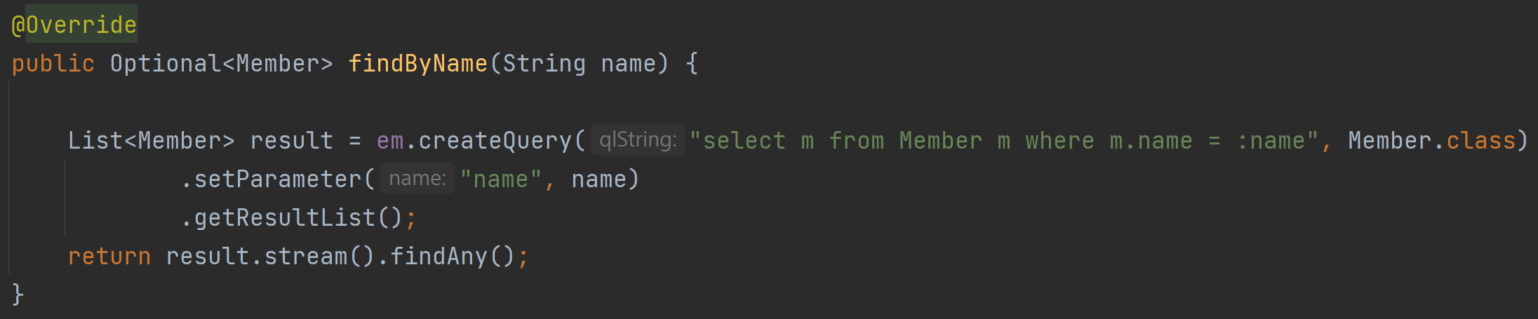 List<Member> result = jdbcTemplate.query("select * from member where name =?",memberRowMapper(), name);