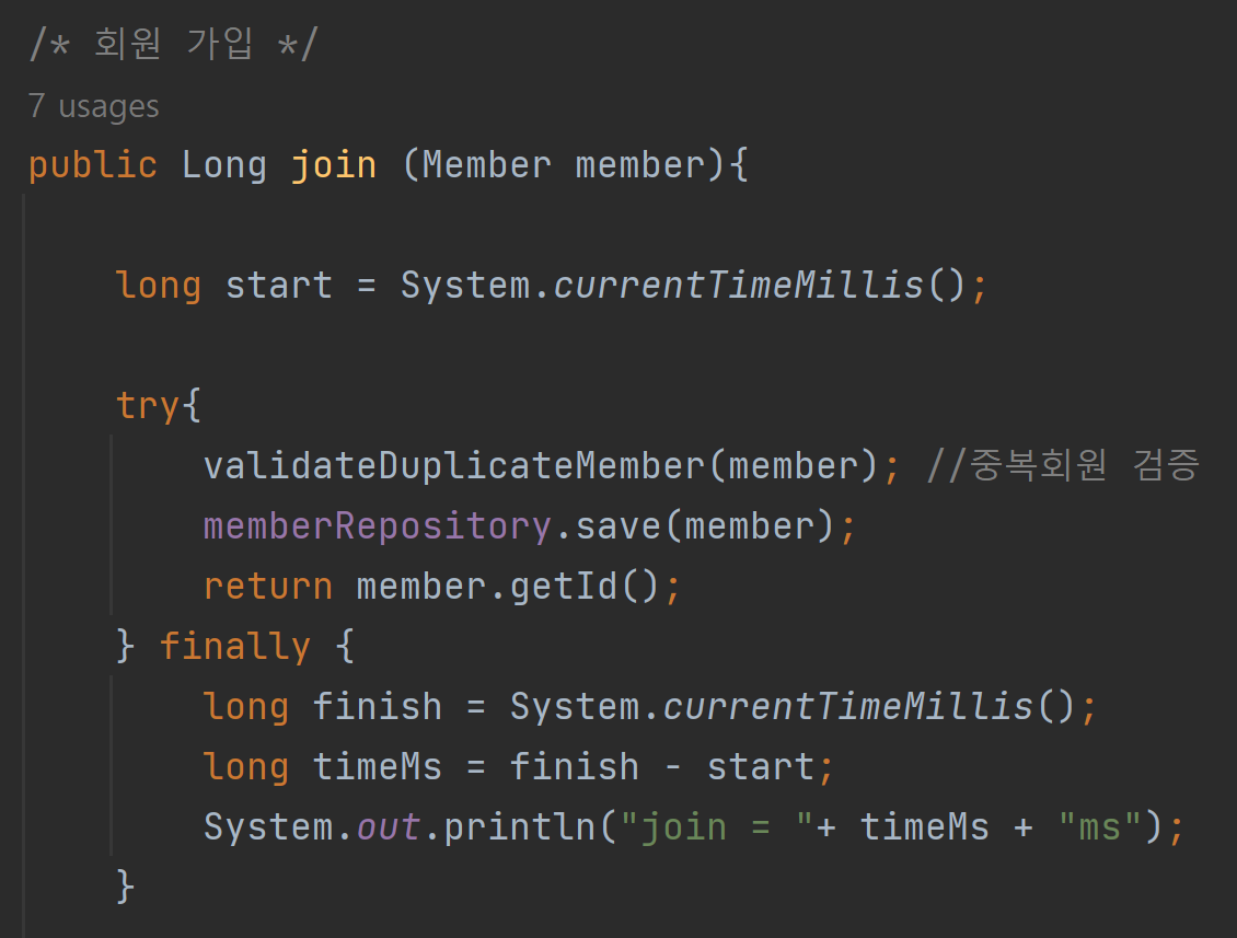 - 시간을 측정하는 로직과 핵심 비즈니스의 로직이 섞여서 유지보수가 어렵다.