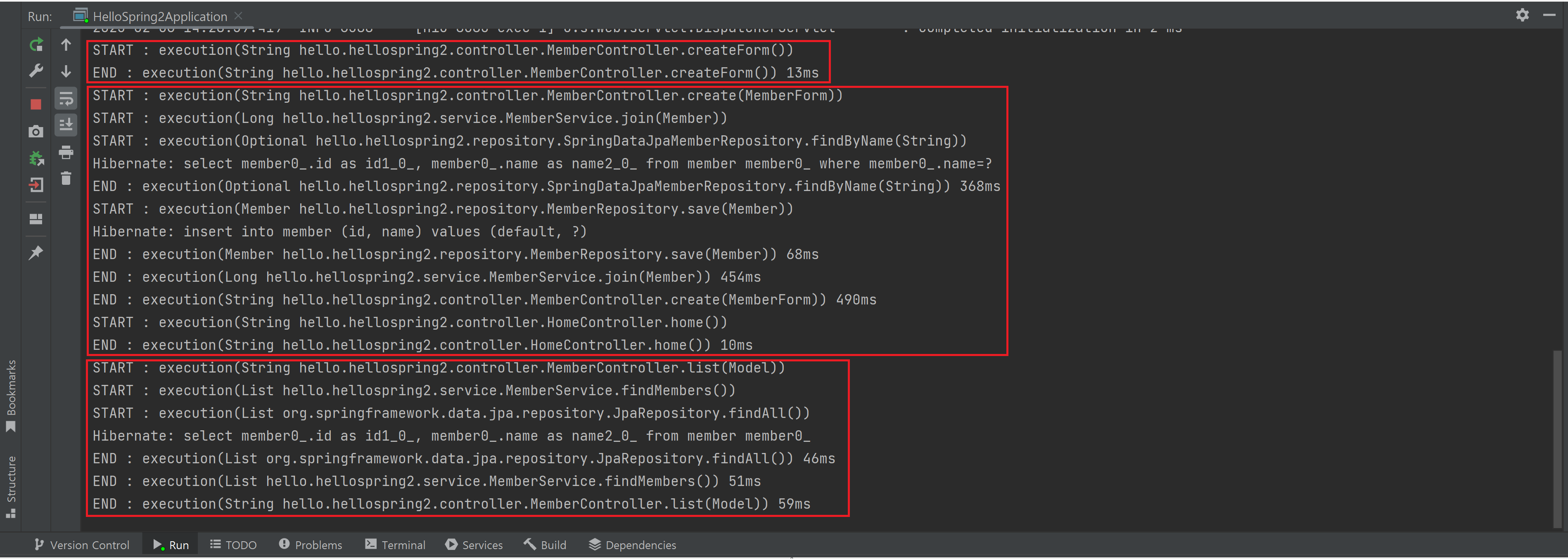 - 회원가입, 회원 조회 등 핵심 관심사항과 시간을 측정하는 공통 관심 사항을 분리한다.