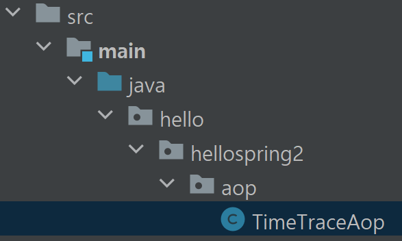 먼저 hello - hellospring2 밑에 aop란 패키지를 만들고 그 안에 TimeTraceAop 클래스를 만든다.