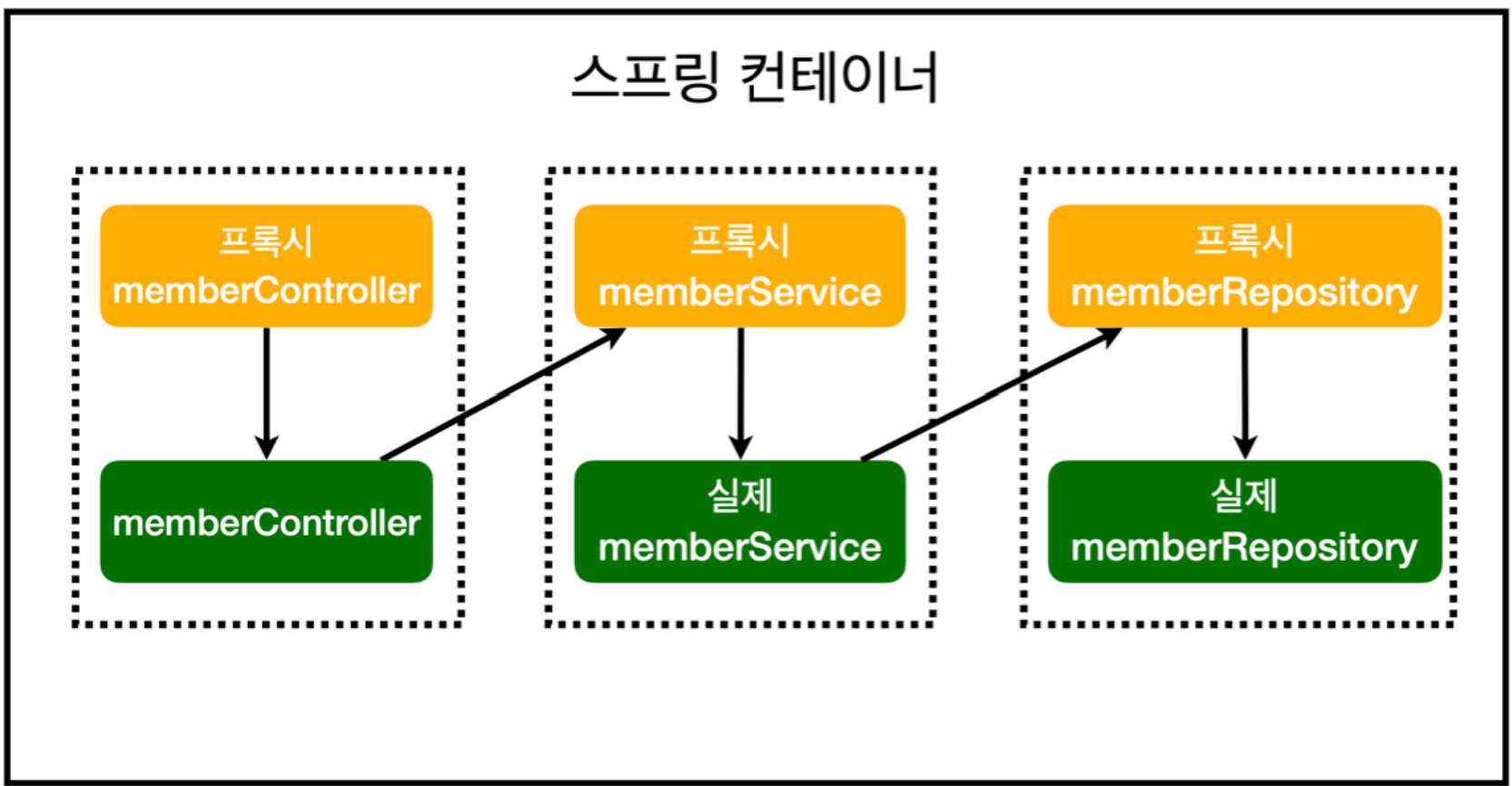 스프링 컨테이너에 스프링 빈을 등록할 때 가짜 스프링 빈을 앞에 세워둔다.