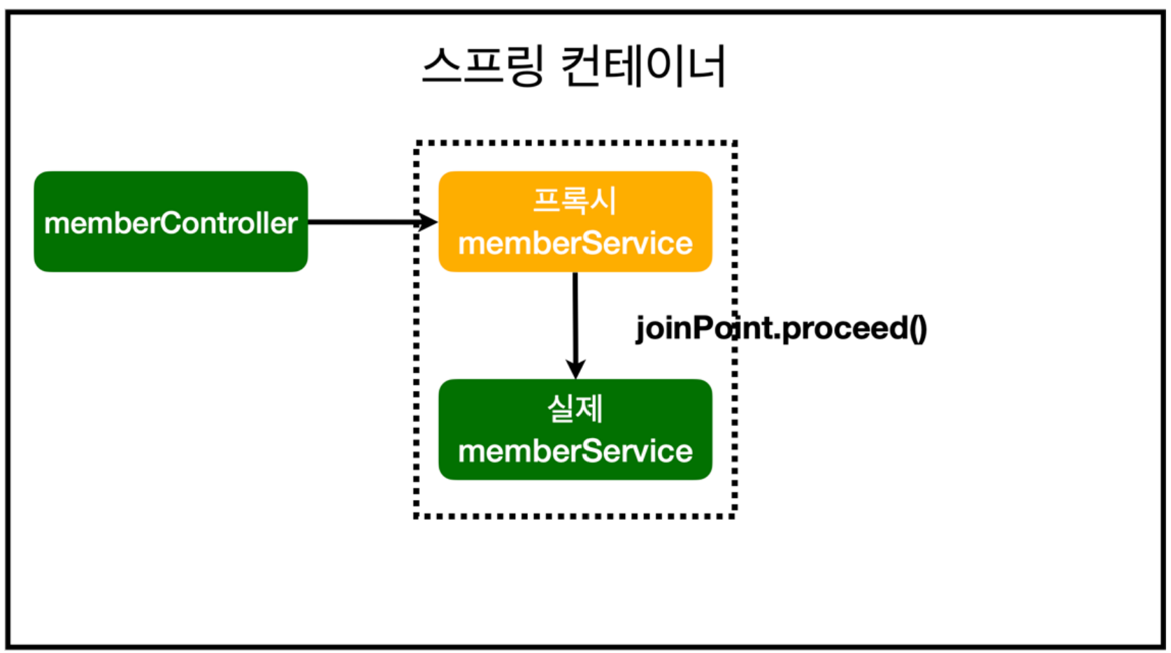 그리고 가짜 스프링 빈이 joinPoint.proceed()하면 그때 진짜 memberSerivce를 호출한다.